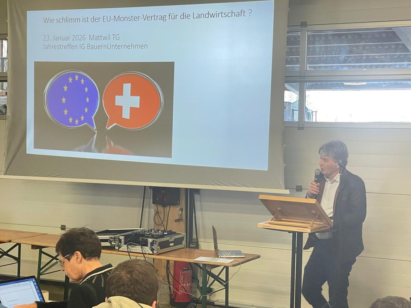 Nationalrat Martin Haab, Präsident des Zürcher Bauernverbandes erläuterte das «Vertragspaket Schweiz-EU aus Sicht der Landwirtschaft». Bei einer Annahme des Vertrages würden unsere Schweizer Agrarstruktur, unsere bäuerliche Vielfalt und die hohen Standards ausgehöhlt und sogar ausgehebelt. Der Vertrag beinhaltet eine zunehmende Zentralisierung, zusätzliche Regulierungen und Kontrollen. Wir müssen uns auch in Zukunft für eine produzierende Landwirtschaft einsetzen, die mit Hilfe modernster Technologien Nahrungsmittel in der Schweiz herstellt und für eine unternehmerische Land- und Ernährungswirtschaftspolitik eintritt. Denn nur so verbessern wir kontinuierlich unsere Produktions- und Verarbeitungsmethoden, um die Erwartungen der Konsumentinnen und Konsumenten an nachhaltige und gesunde Lebensmittel zu erfüllen. Und erreichen schliesslich eine positive landwirtschaftliche Wertschöpfung.